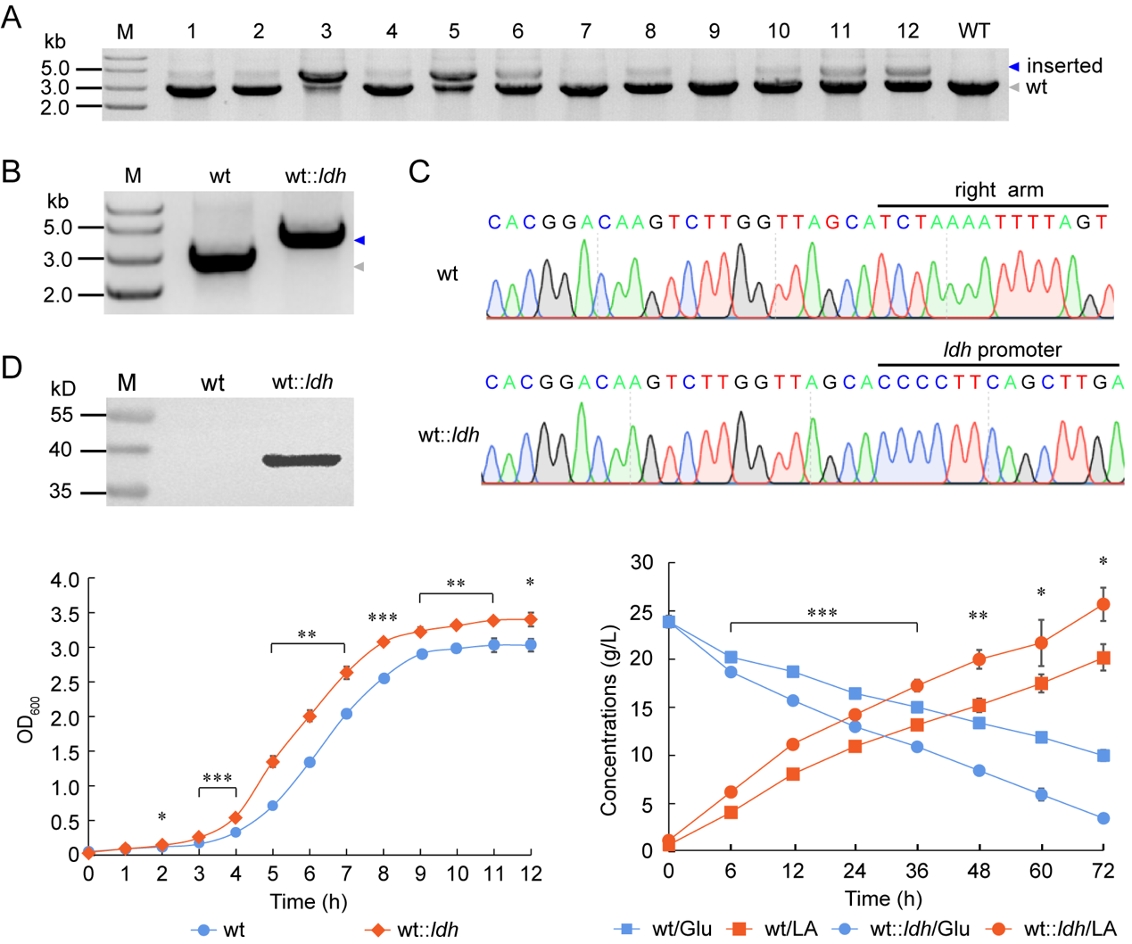 图3.整合超表达乳酸脱氢酶基因显著提高乳酸片球菌的生长速率和乳酸生产速率