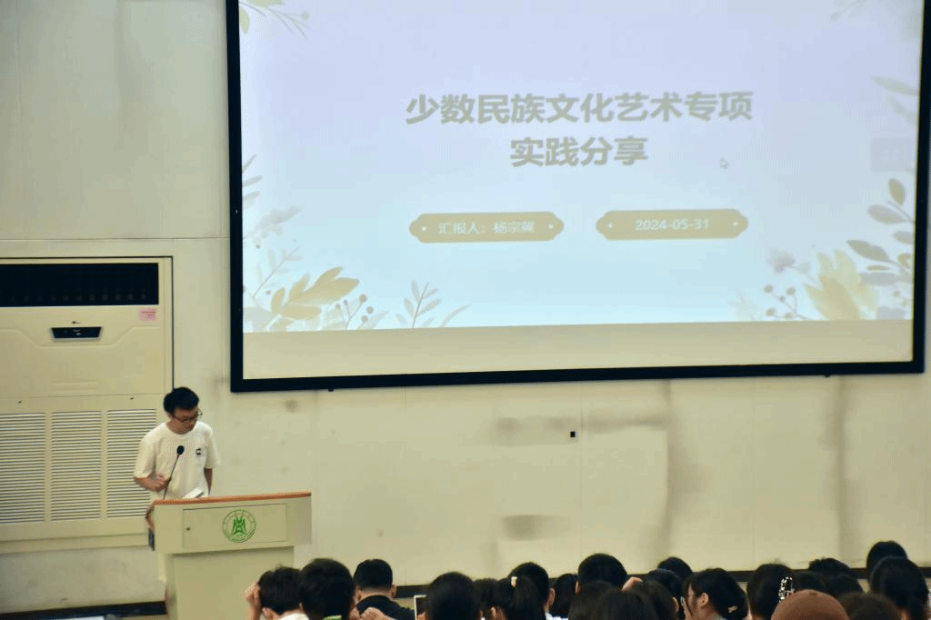 大会还进行了2024年暑期社会实践专项培训。2023年2138cn太阳集团城赴贵州黔东南实践团作为优秀实践案例进行经验分享,实践团队队长杨宗冀杨宗冀分享了参与少数民族文化艺术专项社会实践的心得体会。他表示,选择返乡贵州了解当地少数民族传统文化既是自己一直想要去了解的,又是极具有研究意义的社会选题。他指出,个人兴趣与社会资源相整合是选题必不可少的两个部分。他表示,做好社会实践,前、中、后三个时期的工作都至关重要:前期准备要充分得当,日程安排要合理;中期保障安全、根据实际情况调整计划;后期要及时总结、及时成果转化。他还介绍了一些社会实践途中的趣事,呼吁大家享受社会实践过程,做一个轻松愉快而富有意义的社会实践。