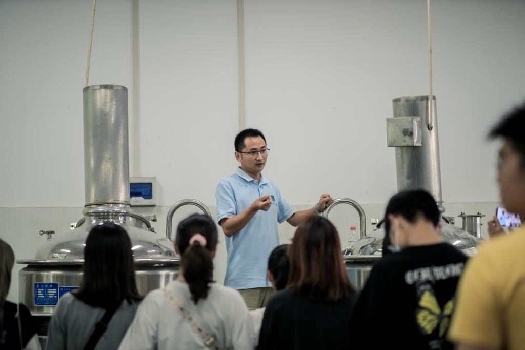 在同学们初步掌握酒的基本知识后,2020级的同学们又来到生物工程实验教学中心,由生科院高级工程师田焕章老师和李金山老师带领同学们参观生物工程实验中心。同学们首先来到了啤酒酿造实验室,在这里,两位老师为他们具体介绍了酿造啤酒所用的原材料、酿造设备和酿造过程等,并着重介绍了我院师生自主酿造的华农嫩啤。参观完啤酒酿造实验室后,两位老师继续带领同学们参观了其他实验室,使同学们提前了解未来学习涉及的实验内容。