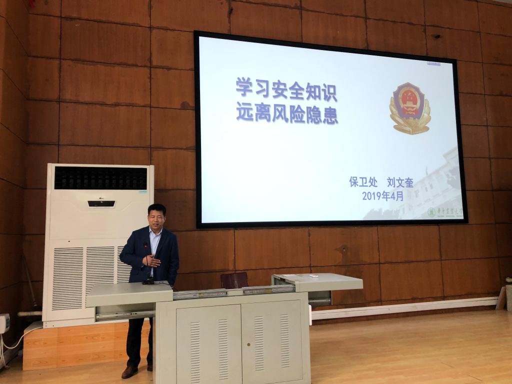 4月26日下午,为提高学生安全意识、保障实验室及宿舍安全,生科院在三教S2报告厅为学院研究生举行安全教育讲座。保卫处刘文奎老师做了“学习安全知识、远离风险隐患”的主题报告,主要内容包括实验室安全、实验室药品管理、寝室安全及人身和财产安全。学院第一综合楼、生物农药工程中心及研究生导师助理等近300名学生参加此次安全培训。