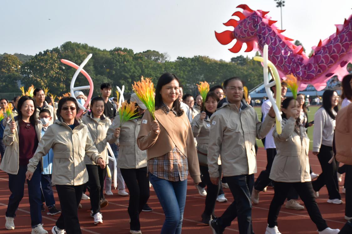 昂扬的舞龙舞狮表演开始,校党委书记高翅为“醒狮”点睛。铿锵有力、热闹非凡的锣鼓响起,锦衣玉狮欢腾起舞,摇头摆尾;赤色长龙飞腾跳跃,威风凌凌,舞出了专属于华农学子的生机与活力!同时现场还进行了全民健身活动,轻快的音乐声响起,在领操员的带领下,全场观众纷纷站起身来舒展筋骨、挥舞手臂,整个运动场上弥漫着青春的力量,热闹的气氛感染着每一个人。