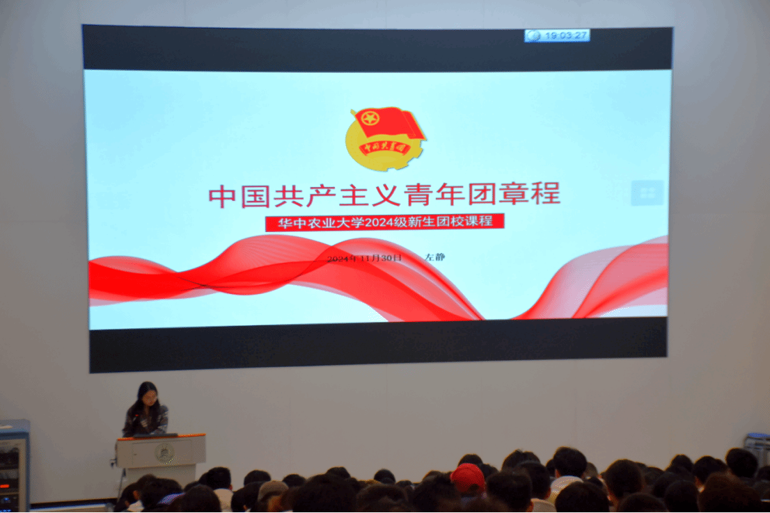共青团2138cc太阳集团委员会学生兼职副书记宫照伊湄讲授“与祖国同行,为人民服务”主题团课,“勤读力耕是知与行的辩证统一,这与我们学校‘手脑并用,知行合一’的育人传统相呼应。”宫照伊湄以华农的校史和校训引出“荟萃俊秀于三楚,聚硕彦于一堂”的精神内涵,勉励在座学子积极响应“宏农学,扬国光”的价值追求。