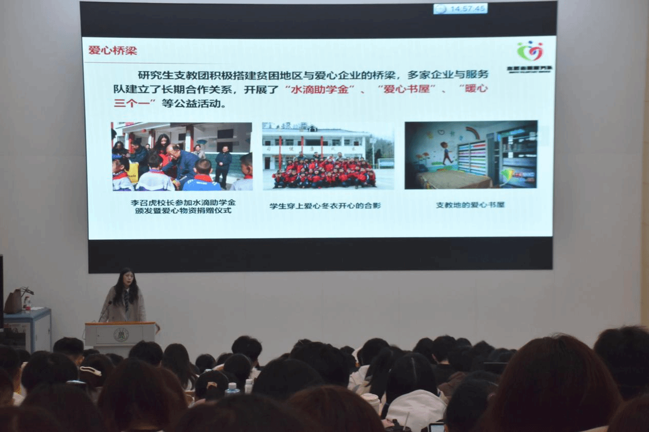 以“本禹志愿服务队”为例,宫照伊湄向同学们介绍徐本禹无私奉献的动人事迹以及“本禹志愿服务队”的发展历程。从个人的星星之火,到团队的守望相助,再到国家、学校、社会多方大力支持,狮山下薪火相传,见证着上千山区学子走向更美好的人生。