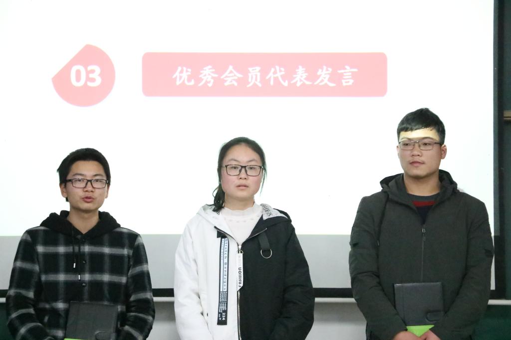 随后第41期理研会三位优秀会员上台接受颁奖并发表他们对理研会的看法。魏欣表示理研会是提供学习之余开拓视野的机会。申洁认为理研会是获得更多知识,结交志同道合朋友的平台。郑立指出理研会不是想象中枯燥的理论学习,而是有多种形式,在这里可以与同学们一起讨论社会热点话题,增加自己对于事件更深一层次的认识。