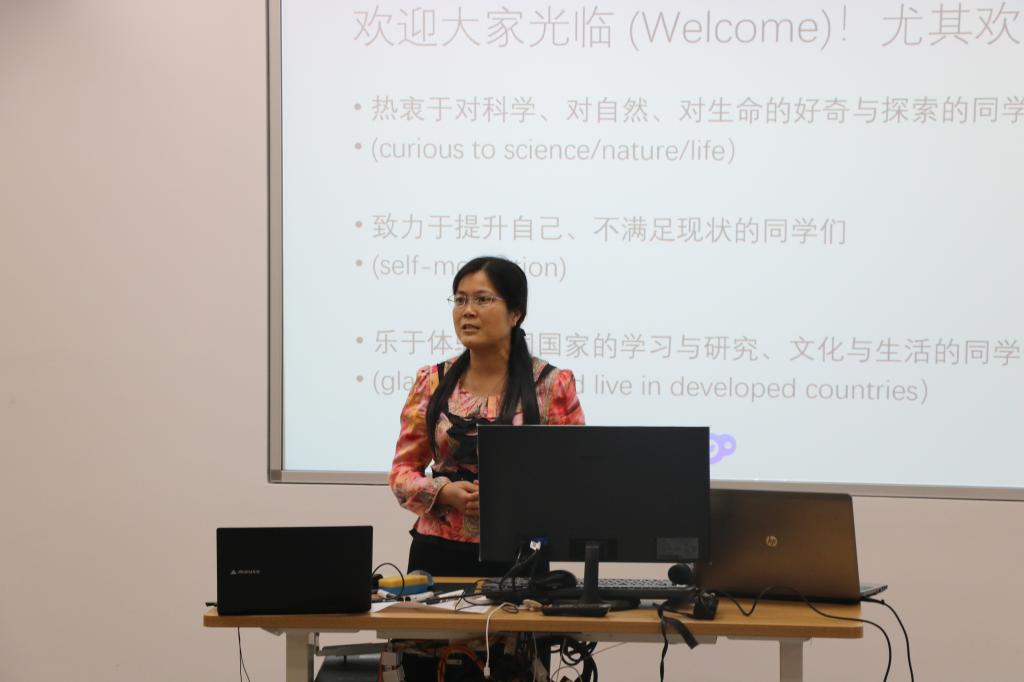 首先由陈春丽老师简要介绍了杜伦大学和宇都宫大学与我院的合作项目,包括课题的方向和实验项目,并鼓励本科生、研究生中对科研有兴趣,对生命科学有探索精神的同学积极参与。她认为:“留学项目有很多优势,一是双导师指导,即外籍老师与我校导师共同指导。二是英语语言运用环境,同学们可以快速提高自己的口语能力。三是国外继续深造,获得国际知名大学学位的机会,同学们能提升自己的各方面能力,得到更多的机会。”陈春丽老师的分享结束后,参加过杜伦大学短期交流学习的16级学生范玉蓉讲述了留学经历。她向大家分享了自己留学期间日常的学习生活,让同学们对留学生活有了更加全面的了解。