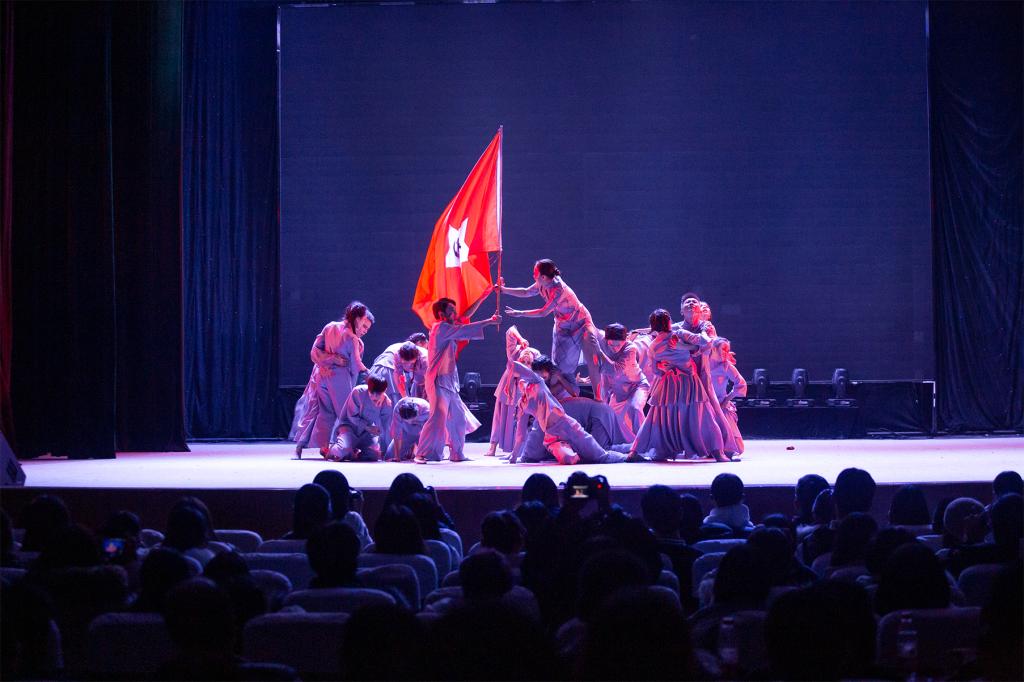 今年正值中华人民共和国成立70周年之际,我院选择演绎《庄严的宣誓》致敬在祖国发展路上牺牲的每一位英雄。地下情报人员紧张地发着电报,冒着生命危险勇敢交换情报,面对枪林弹雨也义无反顾,无一不展示出革命先辈们的顽强斗志。每一句“我宣誓”都是对初心的坚定,每一次倒下后又站起来跑是对现实的不甘,每一声呐喊每一次牺牲都是为了心中共同的信仰......《庄严的宣誓》表达的不仅仅是对革命先烈们的致敬,同样是对新时代每一位追梦人的致敬。