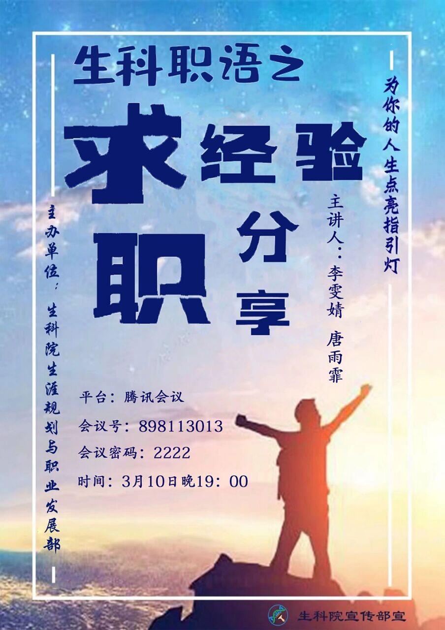 3月10日晚,由我院生涯规划与职业发展部主办的“生科职语”系列活动之求职经验分享会以线上会议的形式顺利举行。生科1601班的唐雨霏、生技1603班的李雯婧两位已经拿到了offer的16级同学作为受邀嘉宾出席本次分享会,分享她们个人就职经历中的感悟。