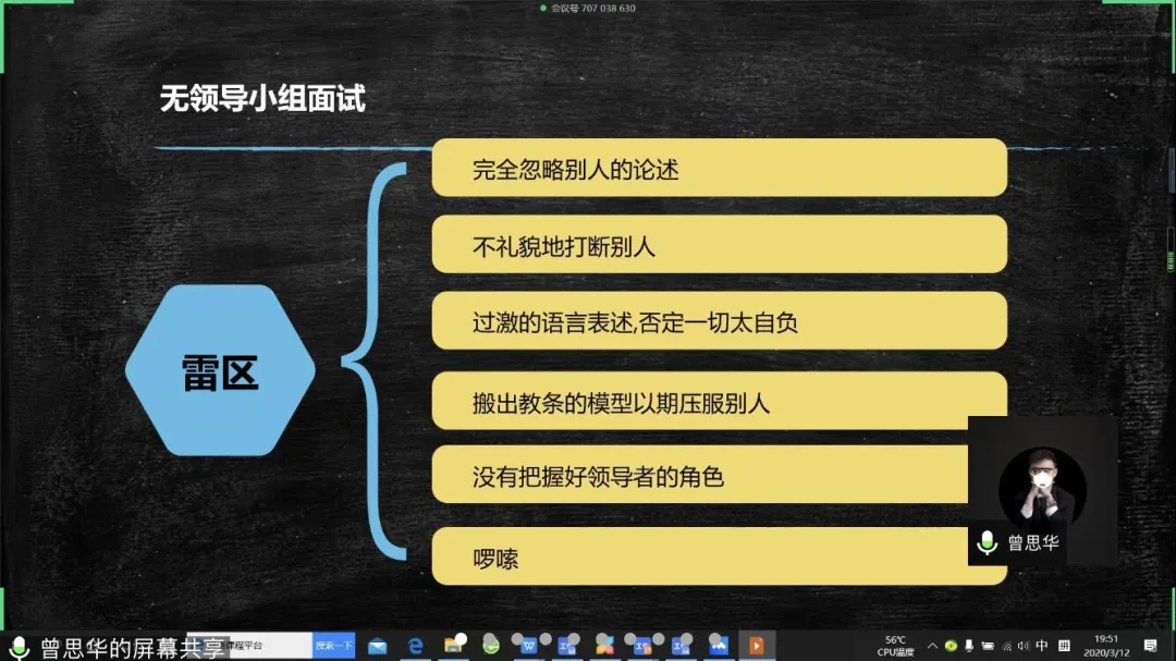 关于面试的主要类型,曾思华将其分为了四种,分别为“面谈法面试”、“展示型面试”、“无领导小组讨论型面试”和“实操演练类面试”。他为我们讲解了每种面试方法的基本形式与特点,并强调每种面试都不容易,不能掉以轻心。对此,曾思华特意为大家详细讲解了面谈式与无领导小组讨论式面试。面谈法主要有六种类型,我们要注意的是漫谈式,因为面试官问的每一个问题都可能是陷阱,需谨慎。结构式面谈有许多问题都是固定的,所以可提前准备。而对于无领导小组讨论式,学长强调,这种面试方法主要是用来淘汰人选的,所以选好自己的角色、积极参与讨论就格外重要了。