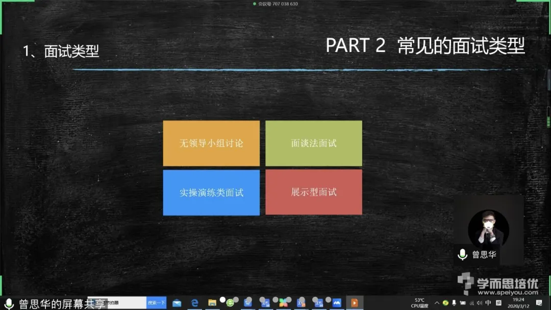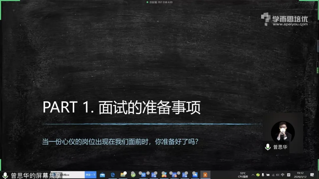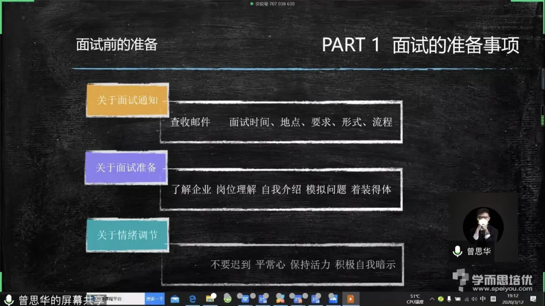 3月12日晚,3月10日晚,由我院生涯规划与职业发展部主办的“生科职语”系列活动之面试技巧分享会以线上会议的形式顺利举行。本次会议邀请到了生科院17届毕业生、现就职于学而思培优的曾思华学长,为大家讲解面试技巧等求职问题。就业辅导员陈超奇老师也参与了本次会议。