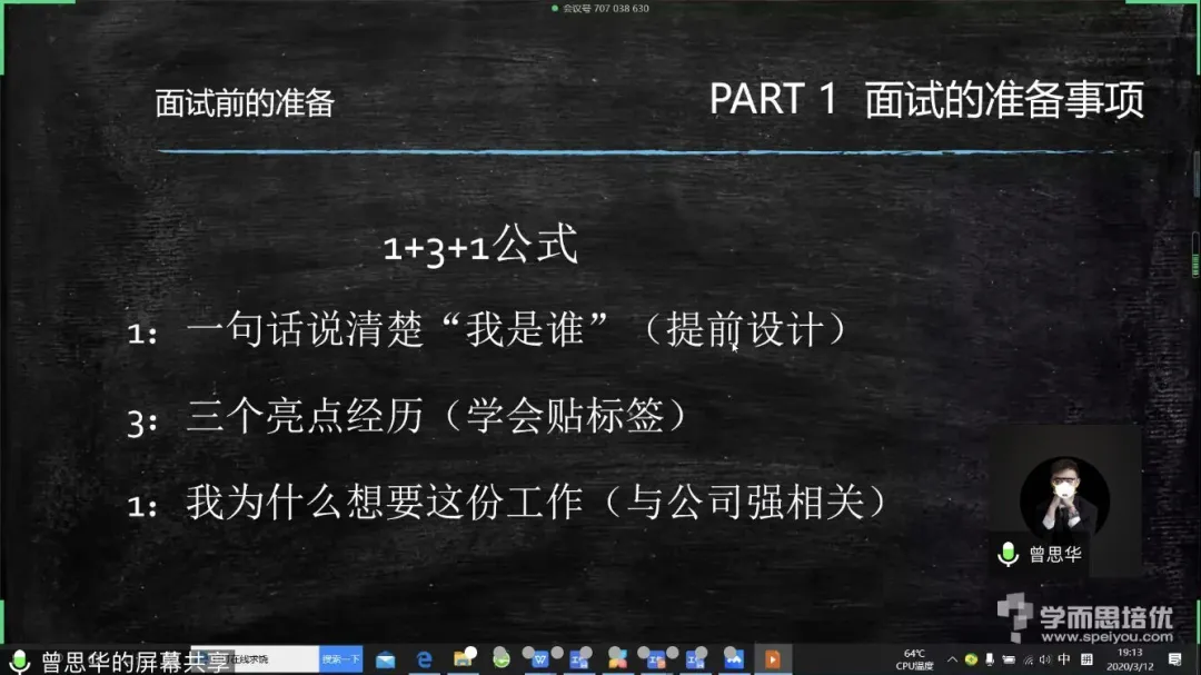 曾思华主要与我们分享了两部分内容。首先是面试的准备事项,曾思华将其概括为三个方面,分别是面试通知、面试准备和情绪调节,并对面试准备进行了重点介绍,他特别提出了面试的“1+3+1”公式,“一句话说清自己是谁”、“说明自己的三个亮点”及“一个能够与公司产生强联系的理由”。同时,他还强调了面试的着装体态的重要性。
