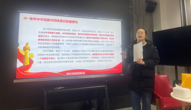 张烜煜同志领学了习近平总书记在中共中央政治局第九次集体学习时的重要讲话精神。她指出,铸牢中华民族共同体意识,就是要引导各族人民牢固树立休戚与共、荣辱与共、生死与共、命运与共的共同体理念。我们应通过构建理论体系,构筑精神家园,促进民族交融,做好宣传工作这几方面,全面推进新时代党的民族工作高质量发展。张烜煜同志随后结合自己做辅导员的经历,谈了日常学生工作中推进民族工作的体会。