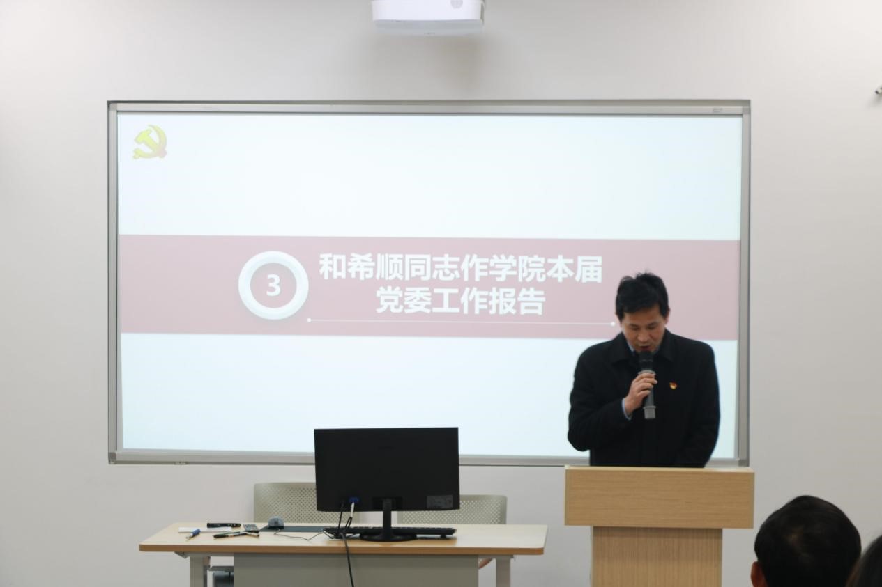 和希顺同志代表学院上一届党委向大会作了题为《凝心聚力,接续奋斗,奋力推进一流学院建设》的工作报告,全文分四个部分:一是本届党委工作回顾;二是新时代学院历史使命与奋斗目标;三是未来五年的重点任务;四是坚持和加强党的全面领导,为建设一流学院提供坚强保障和强大动力。
