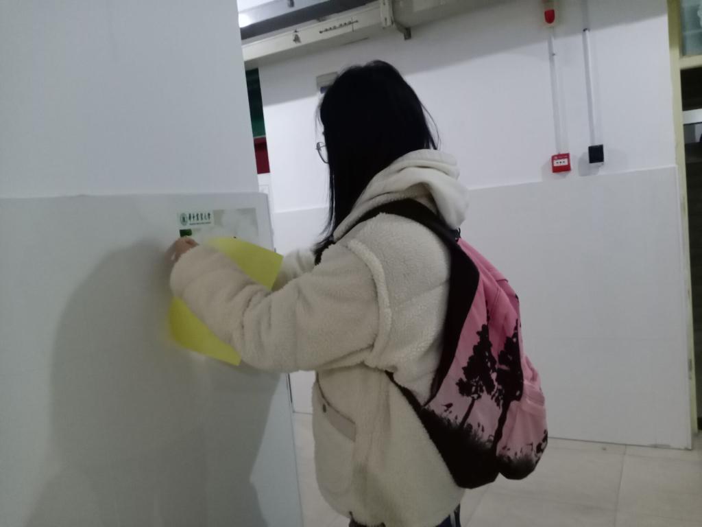 12月3日,按照之前的大致分组,部分成员来到二教检查各教室内桌椅板凳的损坏情况,由杨昕灯、郑厚芳同志分别带其他成员到荟五、荟十六张贴楼道标识。负责张贴标识的同学在领到物品后,开始有条不紊地进行着张贴工作,一张张美观简洁的标识在大家的努力下呈现在寝室楼道中,为来到这里的同学指明方向。