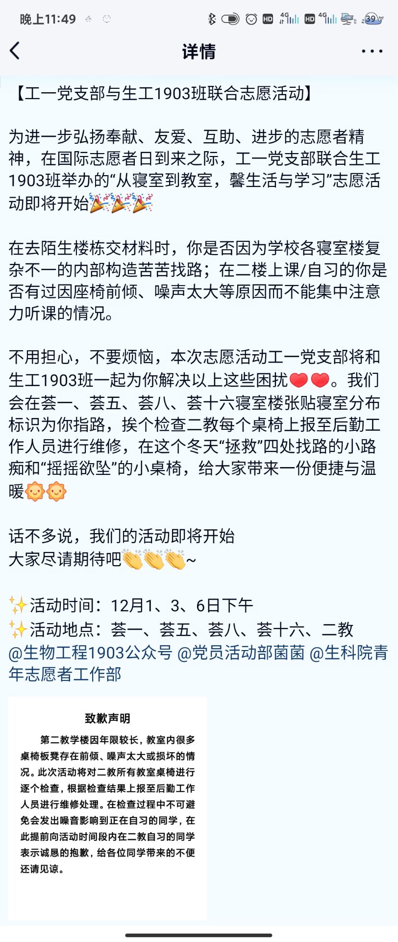 为进一步弘扬奉献、友爱、互助、进步的志愿者精神,展示党员时代风貌,生物工程本科生第一党支部联合生工1903班,在国际志愿者日到来之际,于2020年12月3日开展了以“从寝室到教室,温馨生活与学习”为主题的党员志愿活动。