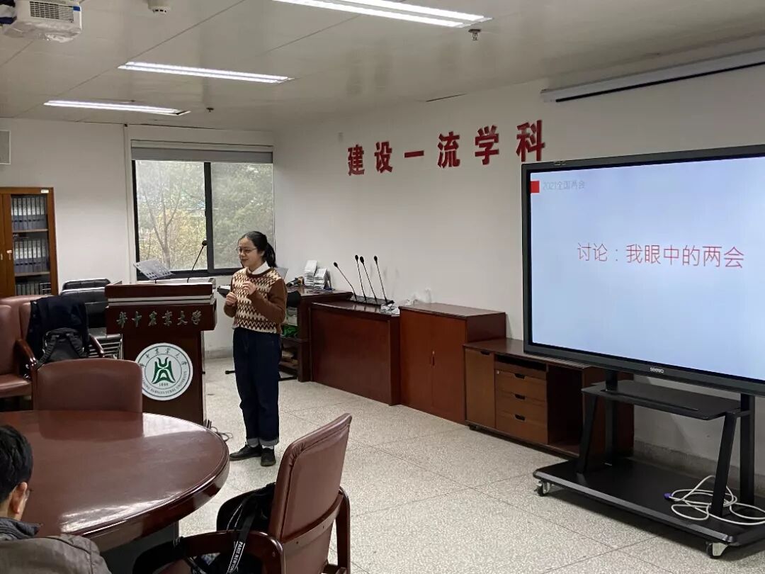 接着,在场师生就两会中自己关注的内容开展探讨。生物科学本科生党支部副支书张博洋同学率先发言,他就教育议题中的“取消低年级家庭作业”、“取消英语主课地位”内容发表看法:小学生年幼,自制力不足,如果没有家庭作业的压力,很容易玩物丧志;英语的学习可以帮助学生与国际接轨,这类语言教育更是需要从小做起。对此,张晓妍同学发表了不同的看法,她认为,大量的作业会限制儿童的全方面发展,也会影响他们的的专注能力与探索能力,儿时的教育应该是建立兴趣与发展品德。吴钰静同学则补充道,如果英语从主课地位去除,则会慢慢的变成“贵族”语言,扩大了社会阶级的差异。陈汝一同学最后分享了《觉醒时代》中的片段,强调了教育公平的重要性,也赞同两会中关于提高乡村教师待遇水平的提议。