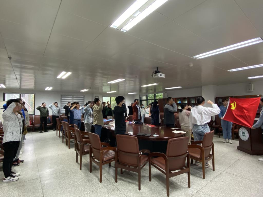 随后孙明老师对党支部工作条例进行讲解和分析。孙明老师提到,为进一步强化高校党支部在党组织中的作用,教工党支部应该一致保证监督党的教育方针贯彻落实,巩固马克思主义在高校意识形态领域的指导地位,加强思想政治引领,筑牢学生理念信念根基,落实立德树人根本任务,保证学生科研管理各项任务完成。学生支部也应该把这个要求落实好,在组织生活各方面严格履行党的义务。和希顺老师补充道,每位党员应遵守党的一切规则,做好群众工作,认真学习党史,从党史学习中吸取精神和力量,不断拥有新的认识,最后转变为自己的思想,贯穿到实际工作当中。最后,四月主题党日在师生共同宣誓中圆满结束。