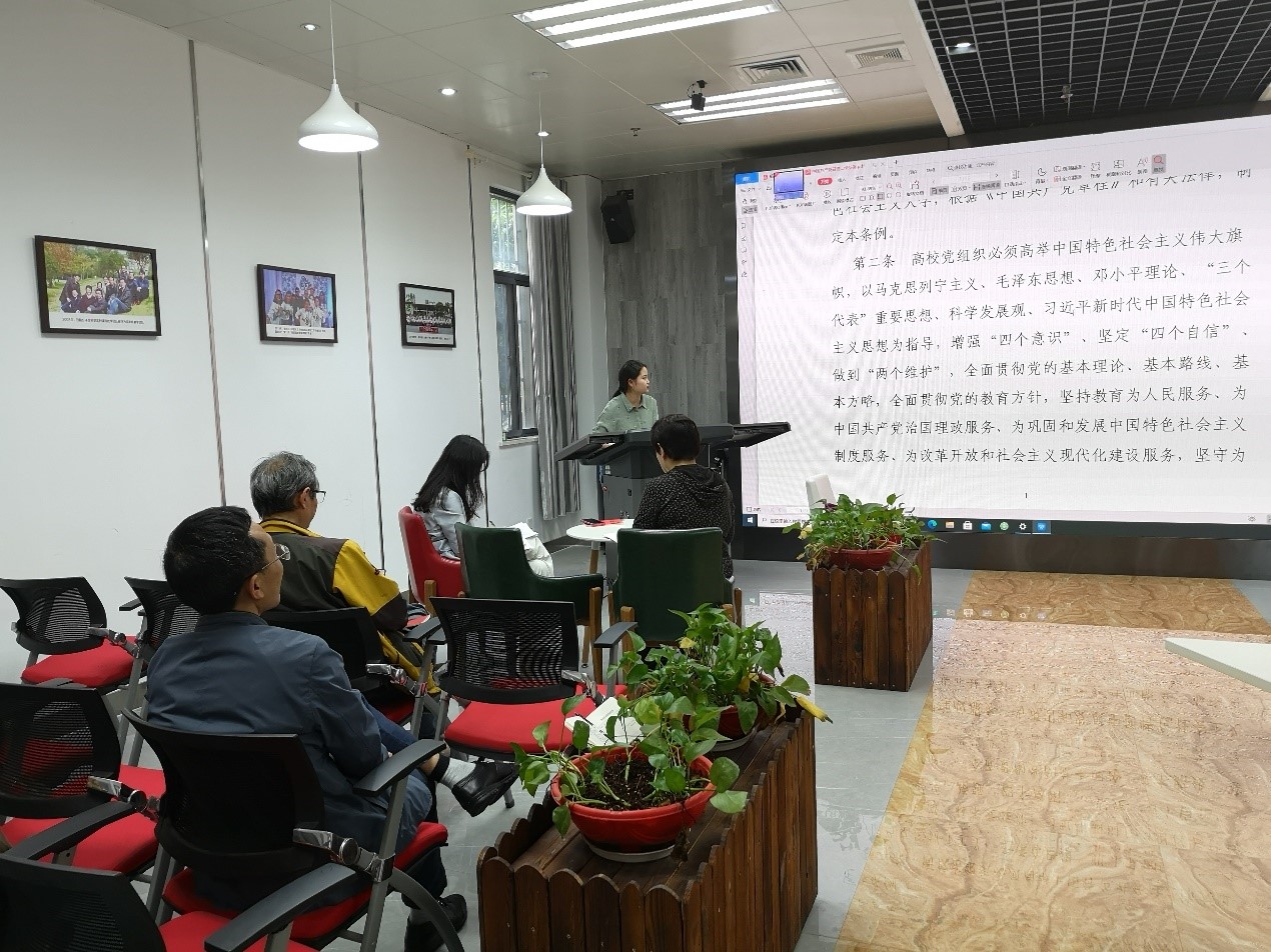 接着,李倩同志带领大家学习了《中国共产党普通高等学校基层组织工作条例》, 工作条例从组织设置、主要职责、党的纪律检查工作、党员队伍建设、干部和人才工作、思想政治工作等方面进行了规定和部署,为支部工作的开展提供了指导性意见。