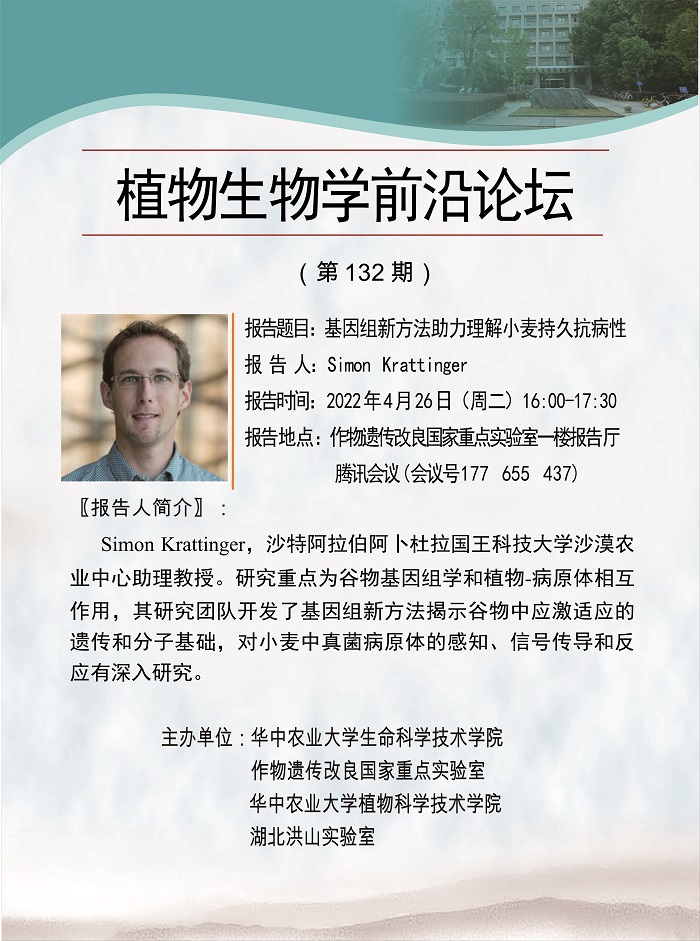 活动时间 报告题目 基因组新方法助力理解小麦持久抗病性