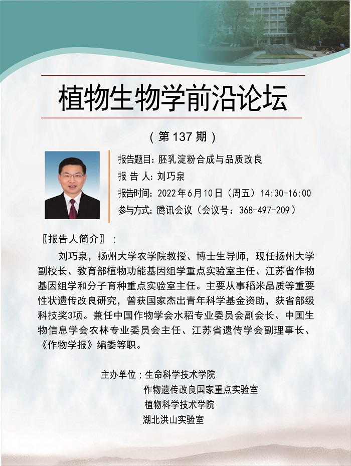 活动时间 报告题目 胚乳淀粉合成与品质改良