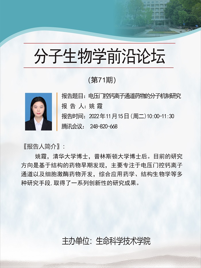 活动时间 报告题目 电压门控钙离子通道药物的分子机制研究