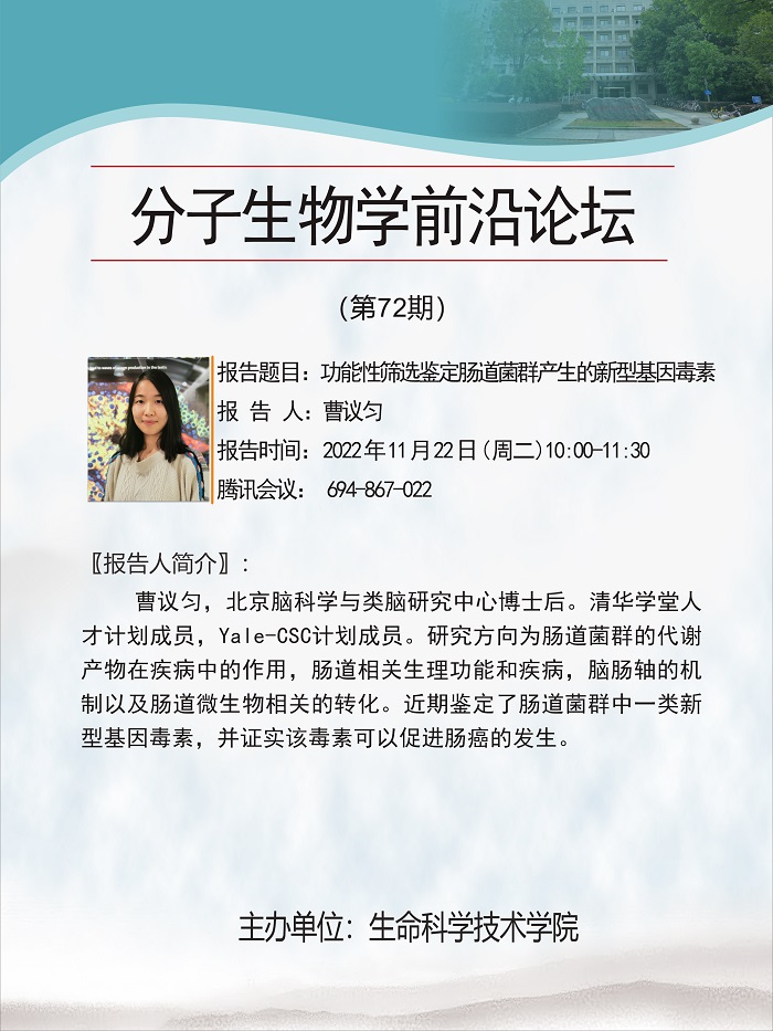 活动时间 报告题目 功能性筛选鉴定肠道菌群产生的新型基因毒素
