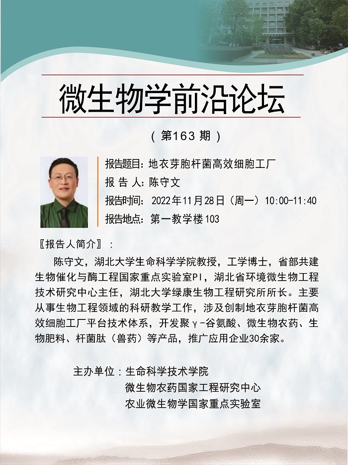 活动时间 报告题目 地衣芽胞杆菌高效细胞工厂