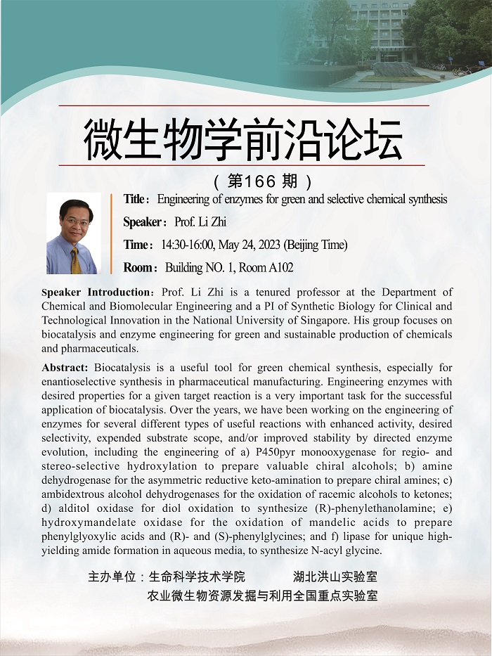 活动时间 报告题目 Engineering of enzymes for green and selective chemical synthesis