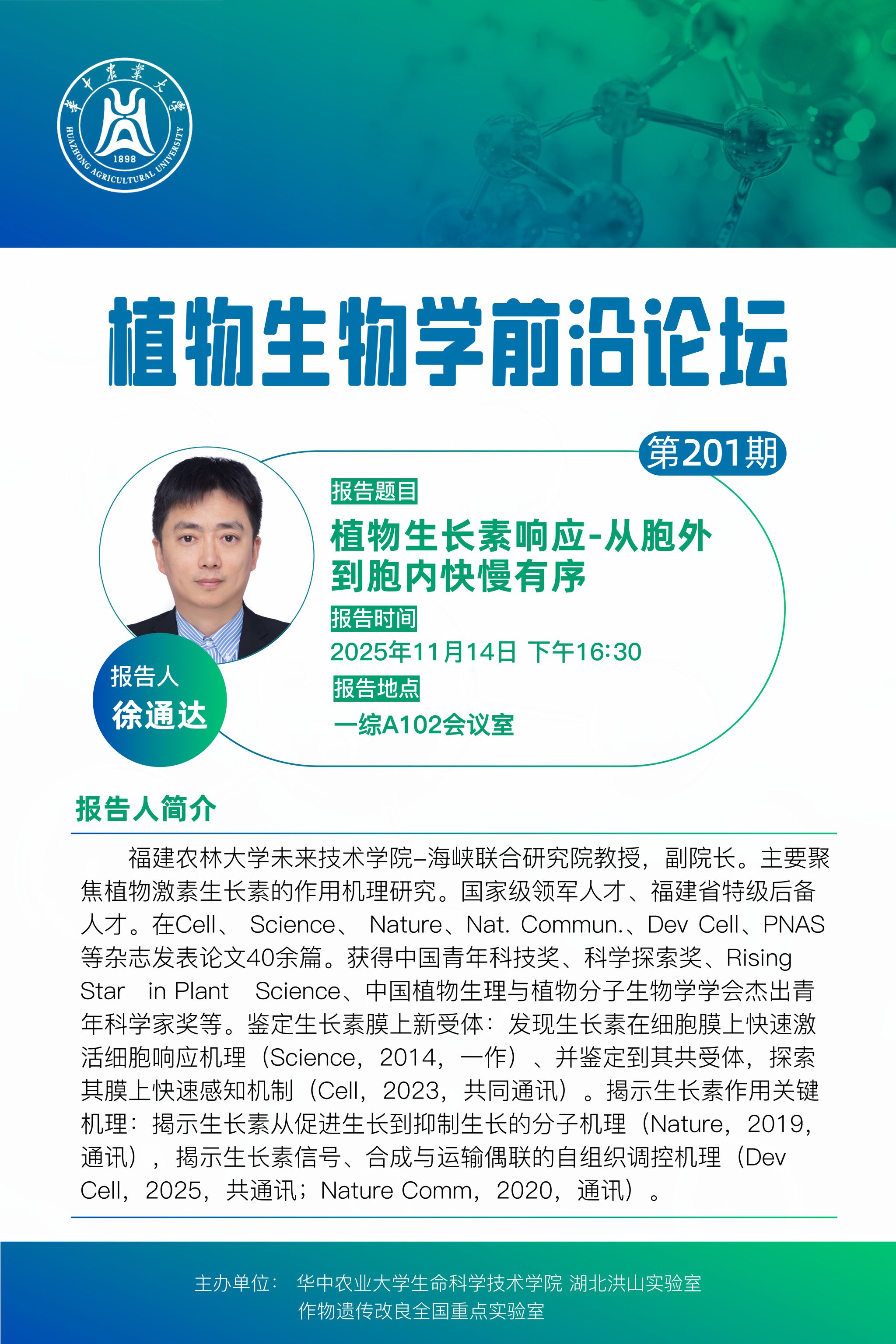 活动时间 2025年11月14日 下午16:30 报告题目 第201期植物生物学前沿论坛