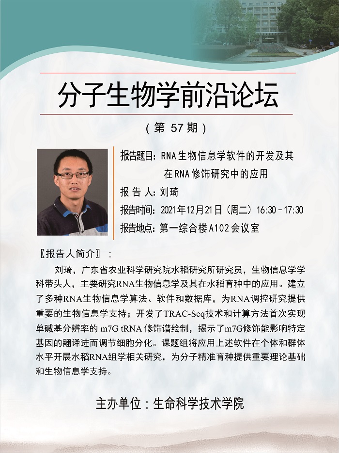 活动时间 报告题目 RNA生物信息学软件的开发及其在RNA修饰研究中的应用