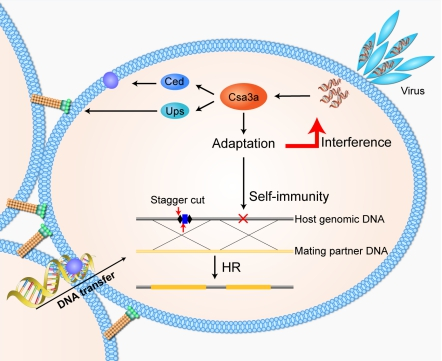 Abstract: CRISPR−Cas system provides acquired immunity against invasive genetic elements in prokaryotes. In both bacteria and archaea, transcriptional factors play important roles in regulation of CRISPR adaptation and interference. In the model Crenarchaeon Sulfolobus islandicus, a CRISPR-associated factor Csa3a triggers CRISPR adaptation and activates CRISPR RNA transcription for the immunity. However, regulation of DNA repair systems for repairing the genomic DNA damages caused by the CRISPR self-immunity is less understood. Here, according to the transcriptome and reporter gene data, we found that deletion of the csa3a gene down-regulated the DNA damage response (DDR) genes, including the ups and ced genes. Furthermore, in vitro analyses demonstrated that Csa3a specifically bound the DDR gene promoters. Microscopic analysis showed that deletion of csa3a significantly inhibited DNA damage-induced cell aggregation. Moreover, the flow cytometry study and survival rate analysis revealed that the csa3a deletion strain was more sensitive to the DNA-damaging reagent. Importantly, CRISPR self-targeting and DNA transfer experiments revealed that Csa3a was involved in regulating Ups- and Ced-mediated repair of CRISPR-damaged host genomic DNA. These results explain the interplay between Csa3a functions in activating CRISPR adaptation and DNA repair systems, and expands our understanding of the lost link between CRISPR self-immunity and genome stability.