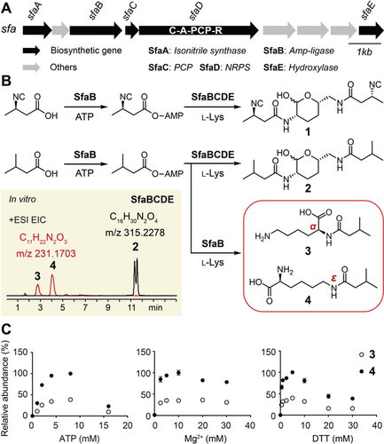 Abstract: SfaB is an adenylation enzyme that adenylates 3-isocyanobutanoic acid for the biosynthesis of diisonitrile natural product SF2768. This enzyme also recognizes a broad range of short-chain fatty acids and their terminally substituted analogues. The substrate flexibility allows the enzymatic synthesis of diverse unnatural N-fatty acyl amides and fatty acyl-CoA/SNAC thioesters using SfaB in vitro, thus expanding the toolbox of biocatalysis. Genome mining of microbial natural products enables chemists not only to discover the bioactive molecules with novel skeletons, but also to identify the enzymes that catalyze diverse chemical reactions. Exploring the substrate promiscuity and catalytic mechanism of those biosynthetic enzymes facilitates the development of potential biocatalysts. SfaB is an acyl adenylate-forming enzyme that adenylates a unique building block, 3-isocyanobutanoic acid, in the biosynthetic pathway of the diisonitrile natural product SF2768 produced by Streptomyces thioluteus, and this AMP-ligase was demonstrated to accept a broad range of short-chain fatty acids (SCFAs). Herein, we repurpose SfaB to catalyze amidation or thioesterification between those SCFAs and various amine or thiol nucleophiles, thereby providing an alternative enzymatic approach to prepare the corresponding amides and thioesters in vitro.