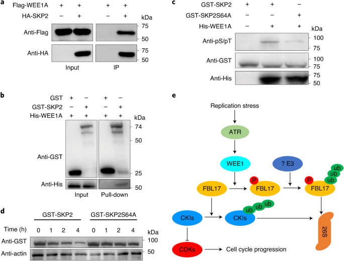 Abstract: DNA replication stress poses a severe threat to genome stability and is a hallmark of cancer as well as a target for cancer therapy. It is well known that the evolutionarily conserved protein kinase WEE1 regulates replication stress responses by directly phosphorylating and inhibiting the major cell cycle driver CDKs in many organisms. Here, we report a novel WEE1 pathway. We found that Arabidopsis WEE1 directly interacts with and phosphorylates the E3 ubiquitin ligase FBL17 that promotes the degradation of CDK inhibitors. The phosphorylated FBL17 is further polyubiquitinated and degraded, thereby leading to the accumulation of CDK inhibitors and the inhibition of CDKs. In strong support for this model, either loss of function of FBL17 or overexpression of CDK inhibitors suppresses the hypersensitivity of the wee1 mutant to replication stress. Intriguingly, human WEE1 also phosphorylates and destabilizes the FBL17 equivalent protein SKP2, indicating that this is a conserved mechanism. This study reveals that the WEE1-FBL17/SKP2-CKIs-CDKs axis is a molecular framework for replication stress responses, which may have clinical implications because the WEE1 inhibitor AZD1775 is currently in phase II clinical trial as an anticancer drug.