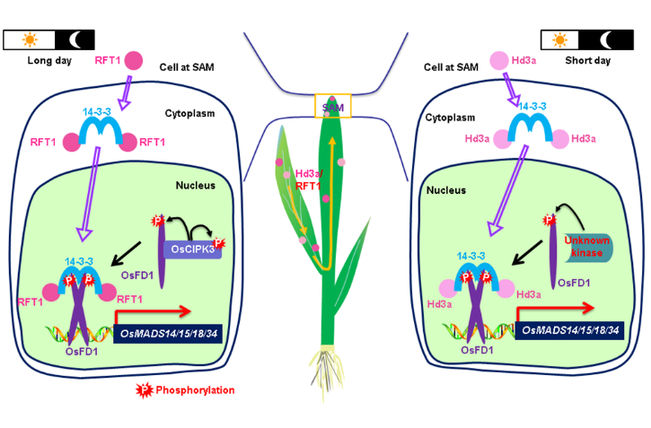Abstract: Heading date is a critical trait that determine the regional adaptability and grain productivity in many crops. Although rice is a facultative short-day plant, its domestication led to the Ghd7-Ehd1-Hd3a/RFT1 pathway to adapt for long-day conditions (LDs). The formation of ‘florigen activation complex’ (FAC) containing florigen Hd3a has been elucidated. However, the molecular composition of FAC with RFT1 for long-day flowering are unclear. We show that RFT1 forms a ternary FAC with 14-3-3 proteins and OsFD1 for flowering under LDs. The calcineurin B-like-interacting protein kinase, OsCIPK3, directly interacts with OsFD1 and phosphorylates OsFD1, which could facilitate FAC to localize in the nucleus. Mutation in OsCIPK3 results in a late heading date under LDs but normal heading date under short-day conditions (SDs). Our results suggest that OsCIPK3 phosphorylates OsFD1 for RFT1-containing FAC formation to initiate flowering in rice under LDs.