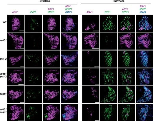 Abstract: Meiosis is a fundamental process for sexual reproduction in most eukaryotes and the evolutionarily conserved recombinases RADiation sensitive51 (RAD51) and Disrupted Meiotic cDNA1 (DMC1) are essential for meiosis and thus fertility. The mitotic function of RAD51 is clear, but the meiotic function of RAD51 remains largely unknown. Here we show that RAD51 functions as an interacting protein to restrain the Structural Maintenance of Chromosomes5/6 (SMC5/6) complex from inhibiting DMC1. We unexpectedly found that loss of the SMC5/6 partially suppresses the rad51 knockout mutant in terms of sterility, pollen inviability, and meiotic chromosome fragmentation in a DMC1-dependent manner in Arabidopsis thaliana. Biochemical and cytological studies revealed that the DMC1 localization in meiotic chromosomes is inhibited by the SMC5/6 complex, which is attenuated by RAD51 through physical interactions. This study not only identified the long-sought-after function of RAD51 in meiosis but also discovered the inhibition of SMC5/6 on DMC1 as a control mechanism during meiotic recombination.