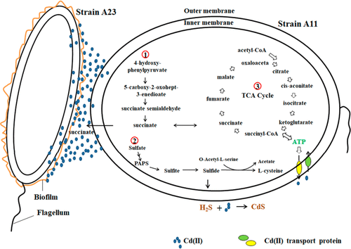 Abstract: Enterobacter sp. A11 and Comamonas sp. A23 were isolated and identified. Coculturing these two strains with Cd(II) led to the production of biofilm, H2S, and succinic acid (SA), and Cd(II) was adsorbed by cells and formed CdS precipitates. After centrifugation, 97% Cd(II) was removed from the coculture. Proteomic and metabolomic analyses of the cocultured bacteria revealed that H2S and SA production pathways, metal transportation, and TCA cycle were active under Cd(II) stress. In vitro addition of SA enhanced the production of H2S and biofilm formation and Cd(II) adsorption. Two-season greenhouse pot experiments with Brassica rapa L. were performed with and without the coculture bacteria. Compared with the control, the average Cd amounts of the two-season pot experiments of the aboveground plants were decreased by 71.3%, 62.8%, and 38.6%, and the nonbioavailable and immobilized Cd in the soils were increased by 211.8%, 213.4%, and 116.7%, for low-, medium-, and high- Cd-spiked soils, respectively. The two strains survived well in soil during plant growth using plate counting, quantitative real-time PCR, and metagenomics analysis. Our results indicate that the combination of Enterobacter and Comamonas strains with the production of H2S and biofilm are important effectors for the highly efficient immobilization of Cd.