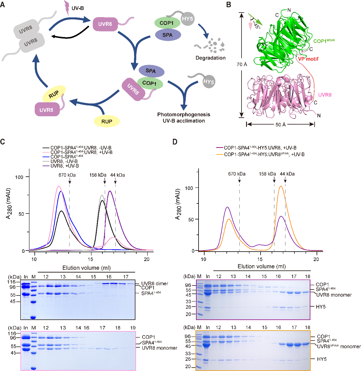 Abstract: The CONSTITUTIVE PHOTOMORPHOGENIC 1-SUPPRESSOR OF PHYA-105 (COP1-SPA) complex is a central repressor of photomorphogenesis. This complex acts as an E3 ubiquitin ligase downstream of various light signaling transduced from multiple photoreceptors in plants. How the COP1-SPA activity is regulated by divergent light-signaling pathways remains largely elusive. Here, we reproduced the regulation pathway of COP1-SPA in ultraviolet-B (UV-B) signaling in vitro and determined the cryo-electron microscopy structure of UV-B receptor UVR8 in complex with COP1. The complex formation is mediated by two-interface interactions between UV-B-activated UVR8 and COP1. Both interfaces are essential for the competitive binding of UVR8 against the signaling hub component HY5 to the COP1-SPA complex. We also show that RUP2 dissociates UVR8 from the COP1-SPA41–464-UVR8 complex and facilitates its redimerization. Our results support a UV-B signaling model that the COP1-SPA activity is repressed by UV-B-activated UVR8 and derepressed by RUP2, owing to competitive binding, and provide a framework for studying the regulatory roles of distinct photoreceptors on photomorphogenesis.