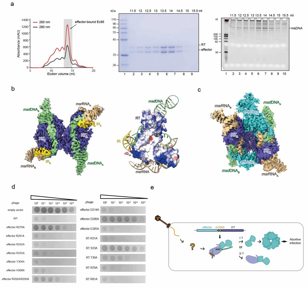 Abstract:First discovered in the 1980s, retrons are bacterial genetic elements consisting of a reverse transcriptase and a non-coding RNA (ncRNA). Retrons mediate antiphage defence in bacteria but their structure and defence mechanisms are unknown. Here, we investigate the Escherichia coli Ec86 retron and use cryo-electron microscopy to determine the structures of the Ec86 (3.1 Å) and cognate effector-bound Ec86 (2.5 Å) complexes. The Ec86 reverse transcriptase exhibits a characteristic right-hand-like fold consisting of finger, palm and thumb subdomains. Ec86 reverse transcriptase reverse-transcribes part of the ncRNA into satellite, multicopy single-stranded DNA (msDNA, a DNA-RNA hybrid) that we show wraps around the reverse transcriptase electropositive surface. In msDNA, both inverted repeats are present and the 3′ sides of the DNA/RNA chains are close to the reverse transcriptase active site. The Ec86 effector adopts a two-lobe fold and directly binds reverse transcriptase and msDNA. These findings offer insights into the structure–function relationship of the retron–effector unit and provide a structural basis for the optimization of retron-based genome editing systems.