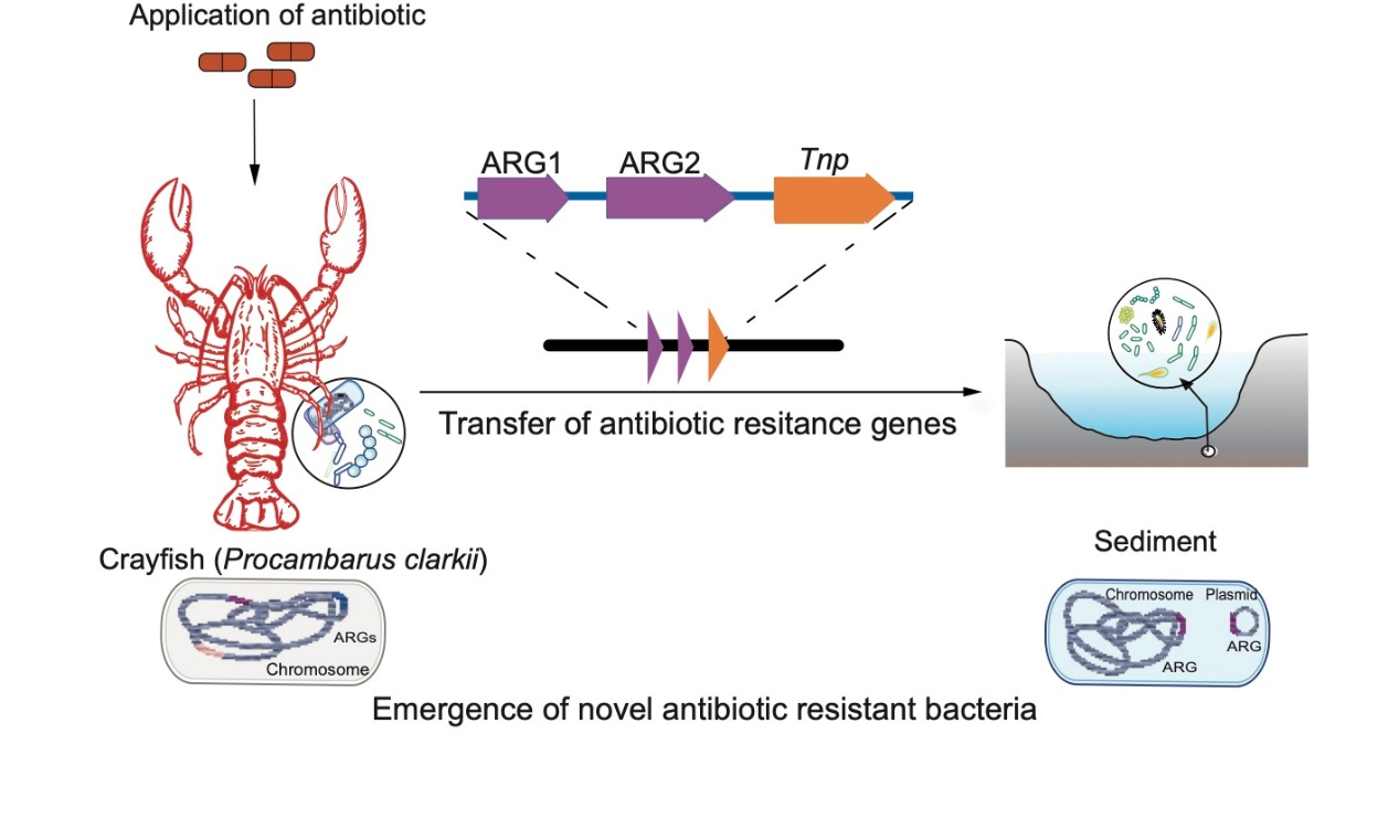 Abstract: Antibiotic resistance genes (ARGs) can be transferred from environmental microbes to human pathogens, thus leading to bacterial infection treatment failures. The aquaculture polluted by over-used antibiotics is considered as a notorious reservoir of ARGs. However, the origin, diachronic changes, and mobility of ARGs under antibiotic exposure in aquaculture systems remain elusive. Our findings showed that enrofloxacin application also increased the relative abundance of various ARGs in addition to quinolone-resistance genes and induced ARG dissemination in crayfish gut and sediment bacteria. Further investigation indicated that the transposase-mediated recombination was the major driver of horizontal gene transfer (HGT) of ARGs under antibiotic stress. Notably, enrofloxacin application also induced the generation of some metagenome-assembled genomes (MAGs) carrying multiple ARGs, which were identified as novel species. Additionally, Enterobacteriaceae constituted a mobile ARG pool in aquaculture. Therefore, aquaculture provides potential wide environmental pathways for generation and spread of antibiotic resistance. Our findings of ARG temporal variations and dissemination pattern in aquaculture with artificial use of antibiotics are critical to the management of antibiotic resistance, which is of great ecosystem and health implications.