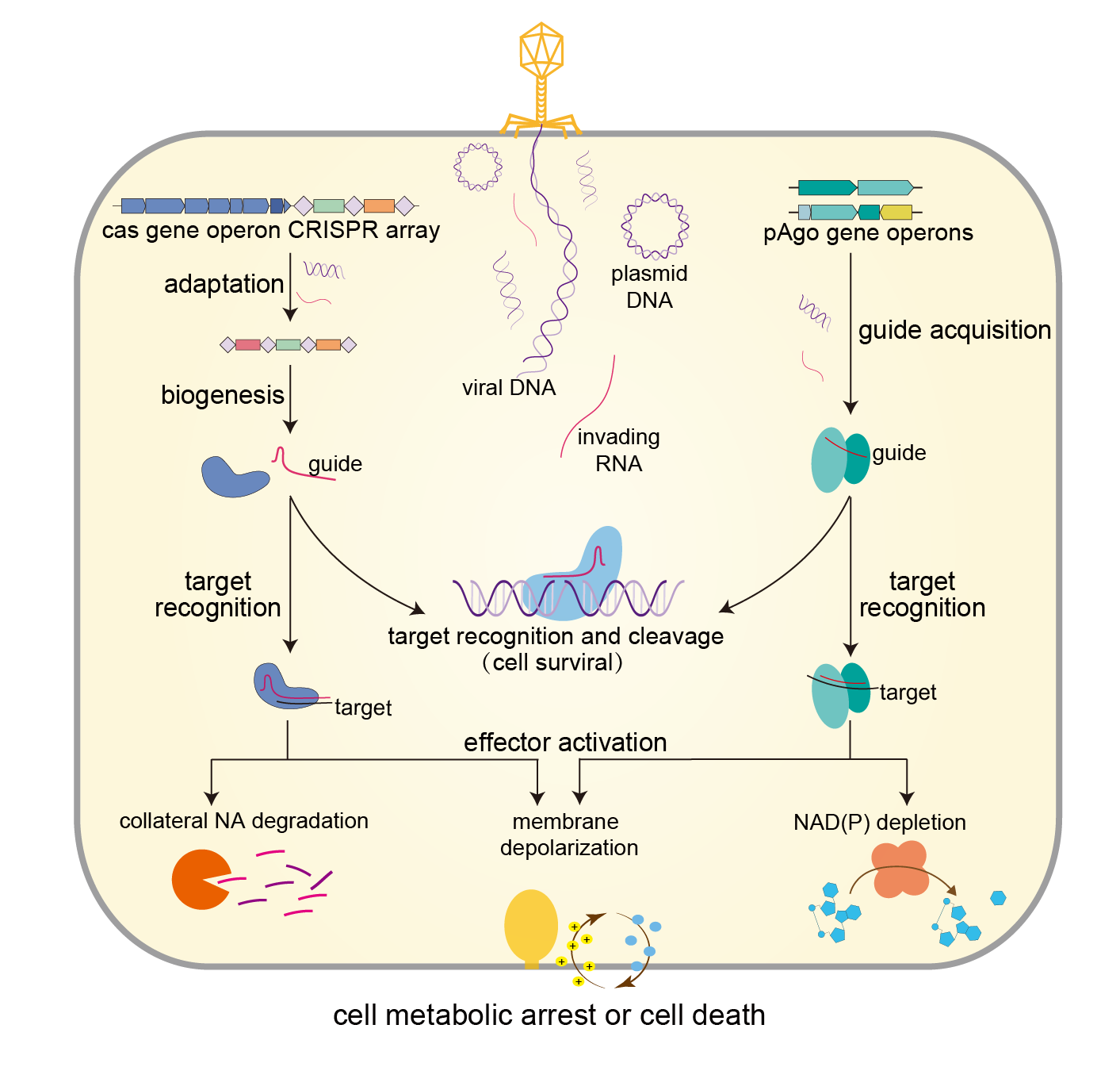 Article: CRISPR-Cas and prokaryotic Argonaute (pAgo) are nucleic acid (NA)-guided defense systems that protect prokaryotes against the invasion of mobile genetic elements. Previous studies established that they are directed by NA fragments (guides) to recognize invading complementary NA (targets), and that they cleave the targets to silence the invaders.CRISPR-Cas and prokaryotic Argonaute (pAgo) are nucleic acid (NA)-guided defense systems that protect prokaryotes against the invasion of mobile genetic elements. Previous studies established that they are directed by NA fragments (guides) to recognize invading complementary NA (targets), and that they cleave the targets to silence the invaders.