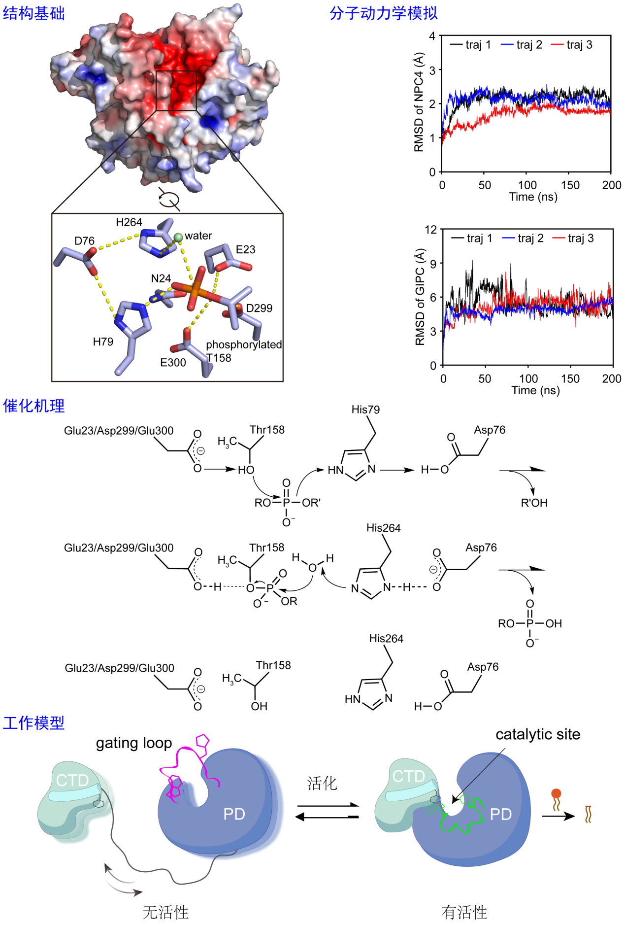 Abstract:Non-specific phospholipase C (NPC) hydrolyzes major membrane phospholipids to release diacylglycerol (DAG), a potent lipid-derived messenger regulating cell functions. Despite extensive studies on NPCs reveal their fundamental roles in plant growth and development, the mechanistic understanding of phospholipid-hydrolyzing by NPCs, remains largely unknown. Here we report the crystal structure of Arabidopsis NPC4 at a resolution of 2.1 Å. NPC4 is divided into a phosphoesterase domain (PD) and a C-terminal domain (CTD), and is structurally distinct from other characterized phospholipases. The previously uncharacterized CTD is indispensable for the full activity of NPC4. Mechanistically, CTD contributes NPC4 activity mainly via CTDα1-PD interaction, which ultimately stabilizes the catalytic pocket in PD. Together with a series of structure-guided biochemical studies, our work elucidates the structural basis and provides molecular mechanism of phospholipid hydrolysis by NPC4, and adds new insights into the members of phospholipase family.