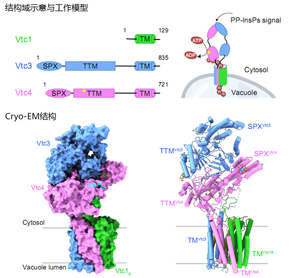 Abstract:Inorganic polyphosphate (polyP) is an ancient energy metabolite and phosphate store that occurs ubiquitously in all organisms. The vacuolar transporter chaperone (VTC) complex integrates cytosolic polyP synthesis from ATP and polyP membrane translocation into the vacuolar lumen. In yeast and in other eukaryotes, polyP synthesis is regulated by inositol pyrophosphate (PP-InsP) nutrient messengers, directly sensed by the VTC complex. Here, we report the cryo-electron microscopy structure of signal-activated VTC complex at 3.0 Å resolution. Baker’s yeast VTC subunits Vtc1, Vtc3, and Vtc4 assemble into a 3:1:1 complex. Fifteen trans-membrane helices form a novel membrane channel enabling the transport of newly synthesized polyP into the vacuolar lumen. PP-InsP binding orients the catalytic polymerase domain at the entrance of the trans-membrane channel, both activating the enzyme and coupling polyP synthesis and membrane translocation. Together with biochemical and cellular studies, our work provides mechanistic insights into the biogenesis of an ancient energy metabolite.