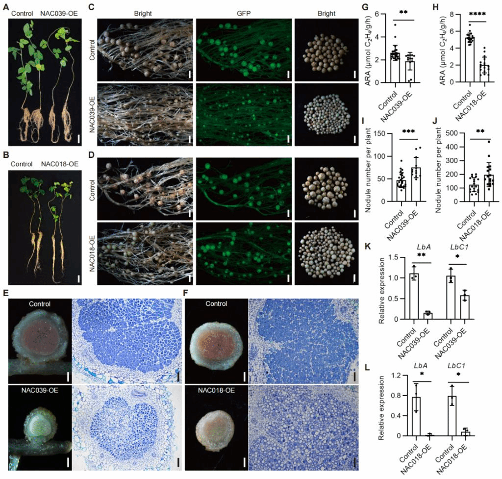 Abstract:Root nodules are major sources of nitrogen for soybean (Glycine max (L.) Merr.) growth, development, production, and seed quality. Symbiotic nitrogen fixation is time-limited, as the root nodule senesces during the reproductive stage of plant development, specifically during seed development. Nodule senescence is characterized by the induction of senescence-related genes, such as papain-like cysteine proteases (CYPs), which ultimately leads to the degradation of both bacteroids and plant cells. However, how nodule senescence–related genes are activated in soybean is unknown. Here, we identified two paralogous NAC transcription factors, GmNAC039 and GmNAC018, as master regulators of nodule senescence. Overexpression of either gene induced soybean nodule senescence with increased cell death as detected using a TUNEL assay, whereas their knockout delayed senescence and increased nitrogenase activity. Transcriptome analysis and nCUT&Tag-qPCR assays revealed that GmNAC039 directly binds to the core motif CAC(A)A and activates the expression of four GmCYP genes (GmCYP35, GmCYP37, GmCYP39 and GmCYP45). Similar to GmNAC039 and GmNAC018, overexpression or knockout of GmCYP genes in nodules resulted in precocious or delayed senescence, respectively. These data provide essential insights into the regulatory mechanisms of nodule senescence, in which GmNAC039 and GmNAC018 directly activate the expression of GmCYP genes to promote nodule senescence.