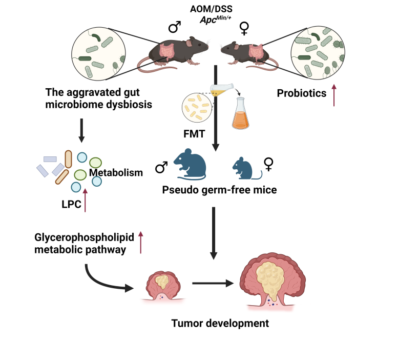 Abstract:Men demonstrate higher incidence and mortality rates of colorectal cancer (CRC) than women. This study aims to explain the potential causes of such sexual dimorphism in CRC from the perspective of sex-biased gut microbiota and metabolites. The results show that sexual dimorphism in colorectal tumorigenesis is observed in both ApcMin/+ mice and azoxymethane (AOM)/dextran sulfate sodium (DSS)-treated mice with male mice have significantly larger and more tumors, accompanied by more impaired gut barrier function. Moreover, pseudo-germ mice receiving fecal samples from male mice or patients show more severe intestinal barrier damage and higher level of inflammation. A significant change in gut microbiota composition is found with increased pathogenic bacteria Akkermansia muciniphila and deplets probiotic Parabacteroides goldsteinii in both male mice and pseudo-germ mice receiving fecal sample from male mice. Sex-biased gut metabolites in pseudo-germ mice receiving fecal sample from CRC patients or CRC mice contribute to sex dimorphism in CRC tumorigenesis through glycerophospholipids metabolism pathway. Sexual dimorphism in tumorigenesis of CRC mouse models. In conclusion, the sex-biased gut microbiome and metabolites contribute to sexual dimorphism in CRC. Modulating sex-biased gut microbiota and metabolites could be a potential sex-targeting therapeutic strategy of CRC.
